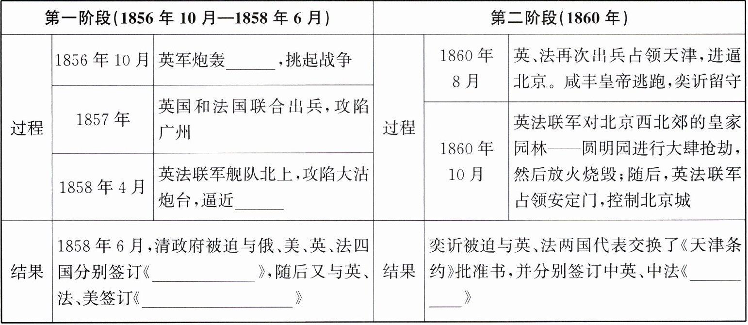 2. 过程:第二次鸦片战争(1856年10月至1860年8月)经历了两个阶段,请结合教材第11页“第二次鸦片战争形势图”,填写下表。