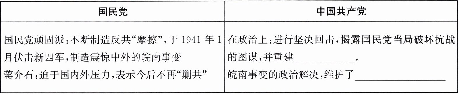 蒋介石:迫于国内外压力,表示今后不再“剿共”|在政治上:进行坚决回击,揭露国民党当局破坏抗战的图谋,并重建______。