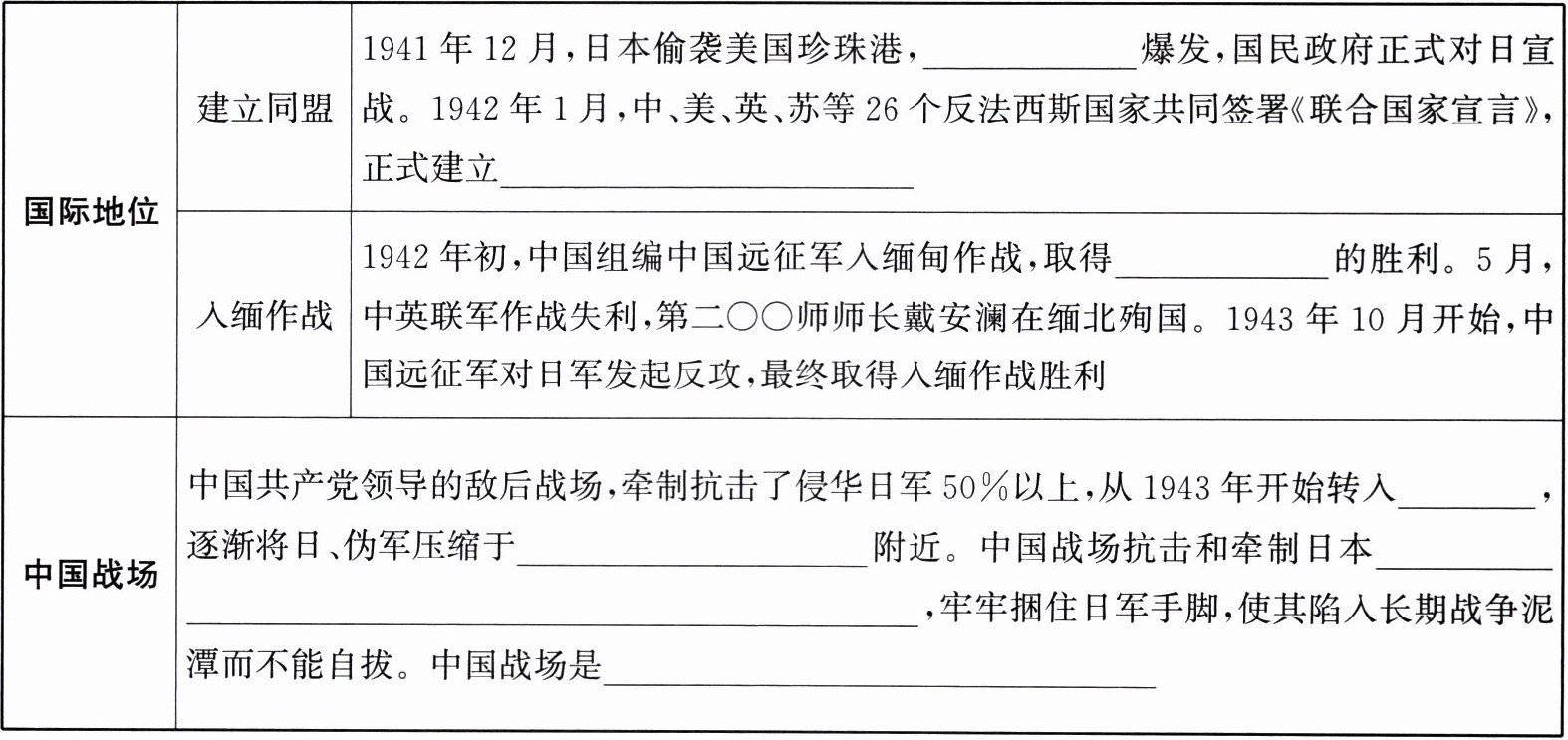 5.太平洋战争 国际反法西斯统一战线 仁安羌战役 反攻 大中城市和交通要道 三分之二以上的陆军和部分海空军事力量 世界反法西斯战争的东方主战场