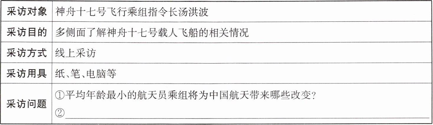 (3)【学习新闻采访】小文同学准备以“神舟十七号载人飞船”为报道对象设计一个采访,请你帮助他完成下面的采访提纲。