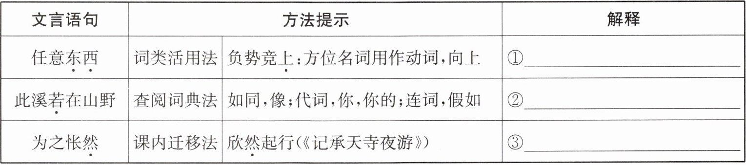 5.①方位名词用作动词,向东或向西(漂流) ②连词,假如 ③……的样子 6.在人间/则可为都邑之胜境/静者之林亭 7.(1)清澈的溪流撞击着岩石,水流回旋从上冲下来,激荡倾注。岸边美丽的树木和珍奇的青竹,投下的阴影互相掩映。 (2)于是进行疏导开通,清除掉杂乱的草木,建起了亭阁,栽上了松树、桂树,又种植了鲜花香草,来增添它优美的景致。 8.纪昀行舟江上,欣赏富春江的山青水绿,表达了对富春山水的喜爱与闲适愉悦之情;吴均描绘富春江的奇山异水,发出“鸢飞戾天者,望峰息心;经纶世务者,窥谷忘反”的感慨,表达了淡泊名利、归隐林泉的愿望;元结描绘右溪的清幽秀美,感叹其不为人所赏识,借此抒发自己怀才不遇、壮志难酬的忧愤。