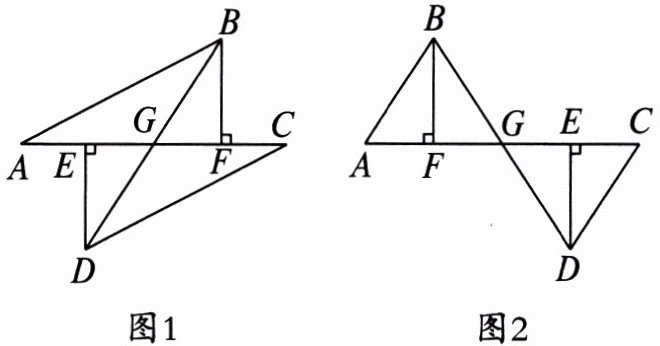6. (1)如图 1,$AC$,$BD$ 相交于点 $G$,点 $A$,$E$,$F$,$C$ 在一条直线上,$AE = CF$,过点 $E$,$F$ 分别作 $DE \perp AC$,$BF \perp AC$,若 $AB = CD$,试证明 $BD$ 平分线段 $EF$。