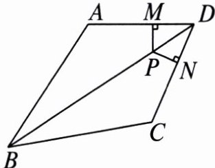 $\therefore \angle ABD = \angle CBD$. 在 $\triangle ABD$ 和 $\triangle CBD$ 中,$\left\{\begin{array}{l}AB = CB,\\ \angle ABD = \angle CBD,\\ BD = BD,\end{array} \right.$ $\therefore \triangle ABD \cong \triangle CBD(SAS)$,$\therefore \angle ADB = \angle CDB$. $\because$ 点 $P$ 在 $BD$ 上,且 $PM \perp AD$,$PN \perp CD$,$\therefore PM = PN$.