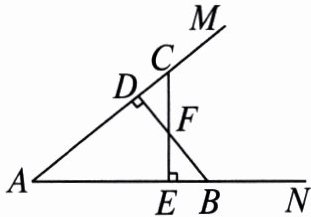 【证明】如图,过$D作DM \perp AB于M$,$DN \perp AC于N$. 因为$\triangle DCE的面积与\triangle DBF$的面积相等,所以$\frac{BF \cdot DM}{2} = \frac{CE \cdot DN}{2}$. 因为$CE = BF$,所以$DM = DN$. 又因为$DM \perp AB$,$DN \perp AC$,所以点$D在\angle BAC$的平分线上,所以$AD平分\angle BAC$.
