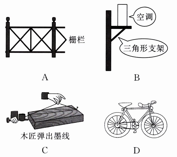 )【解析】选项A,B,D中均利用了三角形的稳定性,选项C中利用的原理是两点确定一条直线.