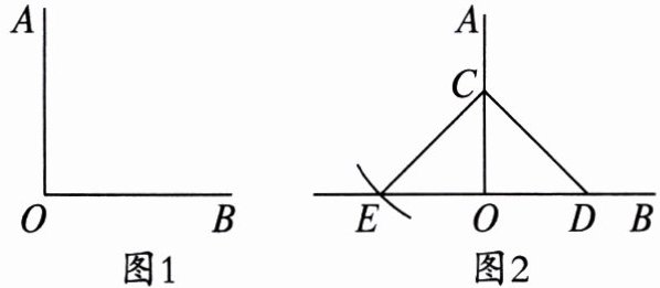 1. 如图 1,已知∠AOB,只用直尺和圆规,如何判断∠AOB 是否为直角?如图 2,小意在 OA,OB 上分别取 C,D,以点 C 为圆心,CD 的长为半径画弧,交 OB 的反向延长线于点 E.若测量得 OE = OD,则∠AOB = 90°.小意判断的依据是(