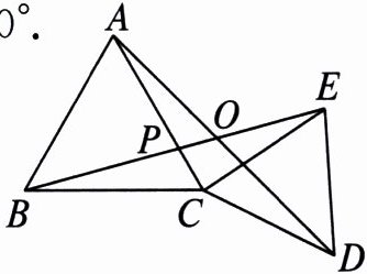 1. 如图,$\triangle ABC$,$\triangle CDE$ 均为等边三角形,连接 $AD$,$BE$ 交于点 $O$,$AC$ 与 $BE$ 交于点 $P$。求证 $\angle AOB = 60^{\circ}$。