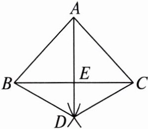 3. 如图,在 $ \triangle ABC $ 中, $ AB = AC $,分别以 $ B $, $ C $ 为圆心,大于 $ \dfrac{1}{2}BC $ 的长为半径画弧,两弧交于点 $ D $,连接 $ BD $, $ CD $, $ AD $, $ AD $ 与 $ BC $ 交于点 $ E $。