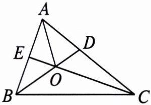 2. 如图,$ \triangle ABC $ 的角平分线 $ BD $ 和 $ CE $ 相交于点 $ O $,连接 $ AO $,若 $ \angle BAC = 70 ^ { \circ } $,则 $ \angle OAE = $