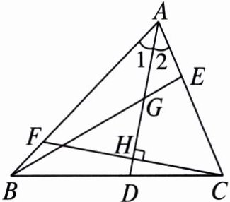 6. 如图,在 $ \triangle ABC $ 中,$ \angle 1 = \angle 2 $,$ G $ 是 $ AD $ 的中点,延长 $ BG $ 交 $ AC $ 于点 $ E $,$ F $ 为 $ AB $ 上一点,$ CF \perp AD $ 交 $ AD $ 于点 $ H $.①$ AD $ 是 $ \triangle ABE $ 的角平分线;②$ BE $ 是 $ \triangle ABD $ 的边 $ AD $ 上的中线;③$ CH $ 为 $ \triangle ACD $ 的边 $ AD $ 上的高;④$ AH $ 是 $ \triangle ACF $ 的角平分线和高线. 上述说法正确的有