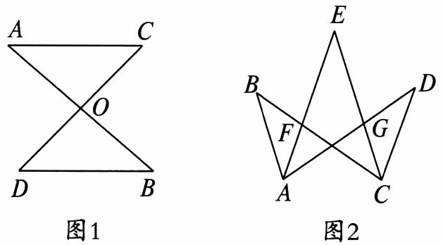 (1)证明:在△AOC中,∠A+∠C+∠AOC=180°;在△BOD中,∠B+∠D+∠BOD=180°。