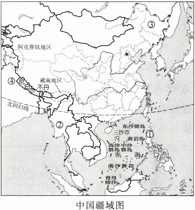 6. 国家版图是指一个国家行使主权和管辖权的疆域。2024 年 8 月 29 日是我国第 21 个测绘法宣传日,倡导规范使用标准地图,提升公众国家版图意识。读中国疆域图,完成下列要求。