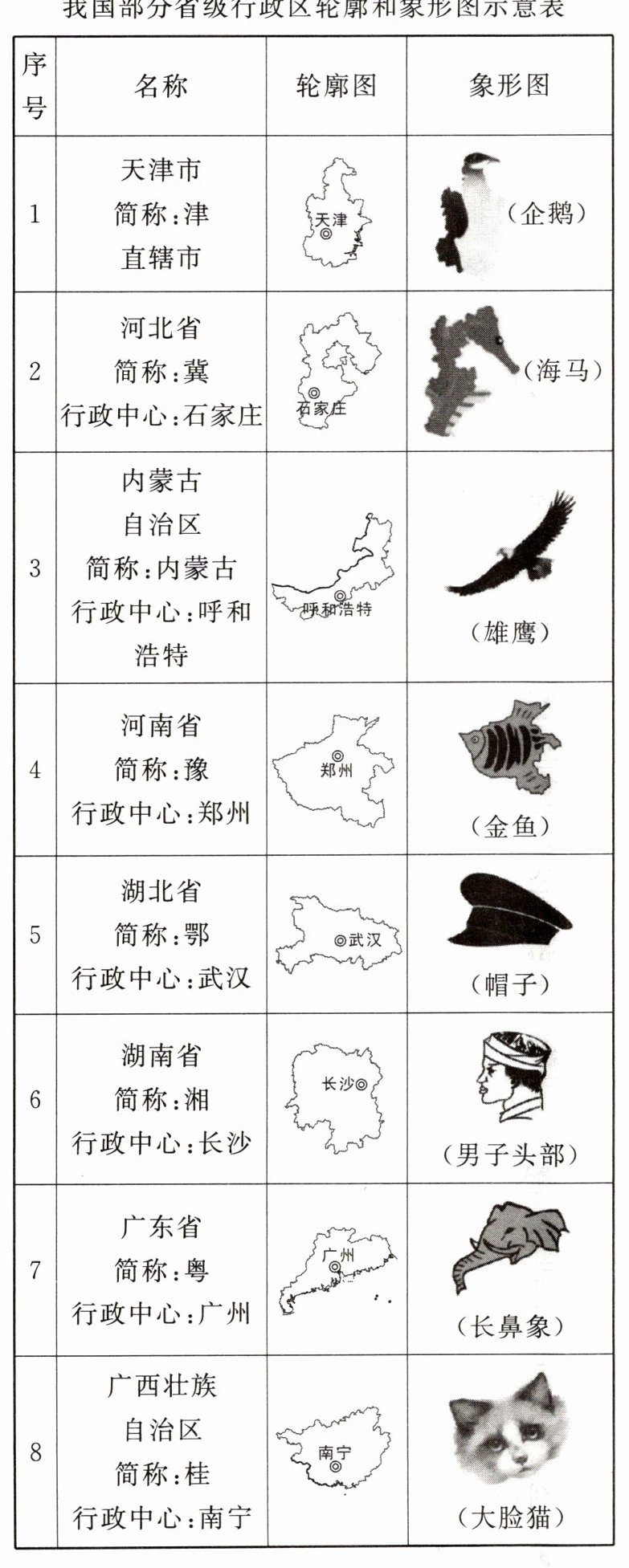 读我国部分省级行政区轮廓和象形图示意表(每个轮廓的象形图不是唯一的),我国其他省级行政区轮廓可以想象成什么图案辅助记忆呢?