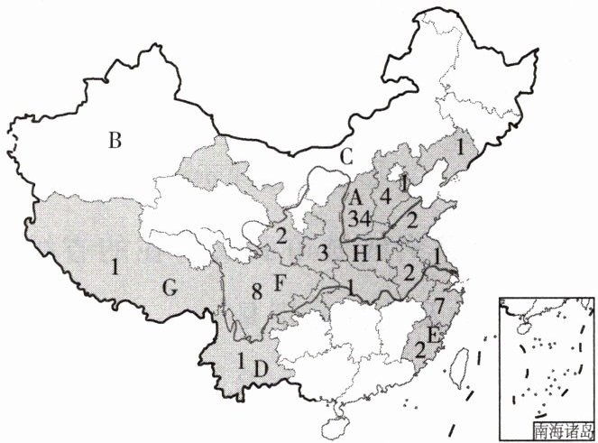。(填字母)(2)选取部分取景地D-H,填写出各省级行政区对应的名称、简称和行政中心。