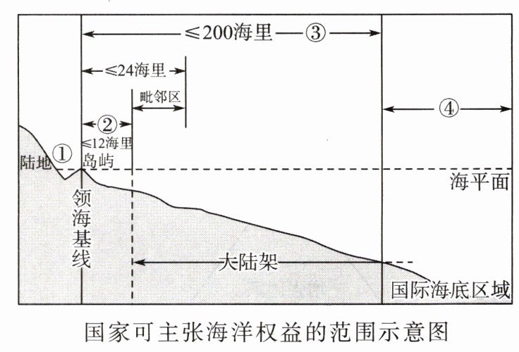 读国家可主张海洋权益的范围示意图,结合所学知识,填写出数字代表的含义。
