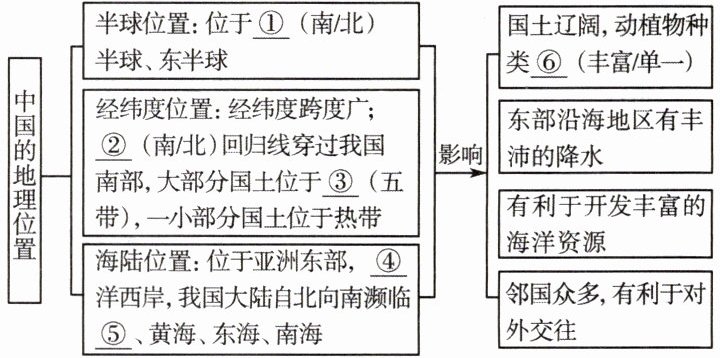 (3)我国国界线漫长,口岸众多,贸易发达,这离不开优越的地理位置。请结合框架图中信息,在横线上填写恰当内容。
