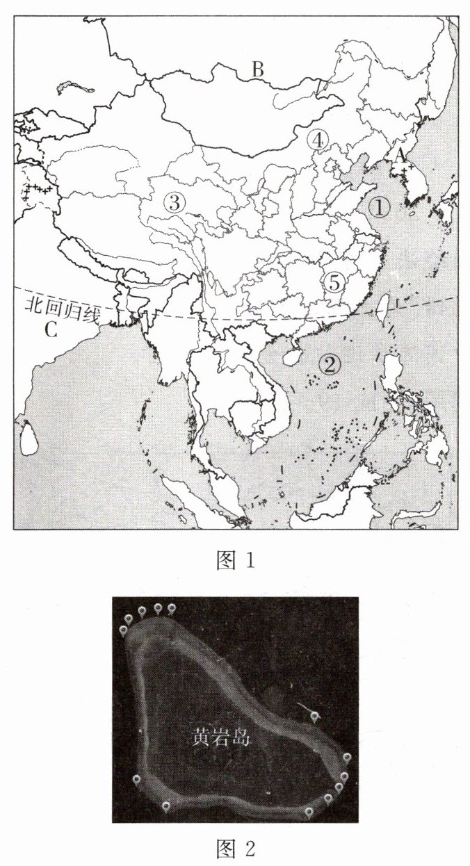 材料三:图1为中国疆域图,图2为黄岩岛领海基线示意图。