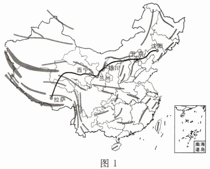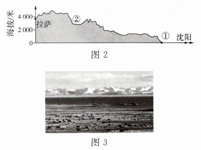 几位游客以体验和探索地理景观为目的,从沈阳出发,沿国道自驾前往拉萨旅游。图1为行程路线示意图,图2为沿途地形剖面示意图,图3为青藏高原景观图。