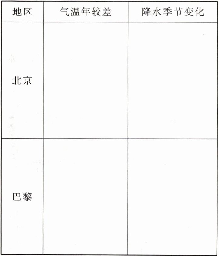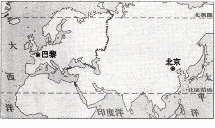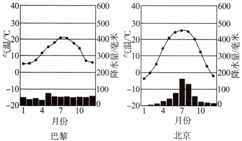 材料二:下图分别为巴黎和北京的位置示意及两城市各月气温和降水量图。