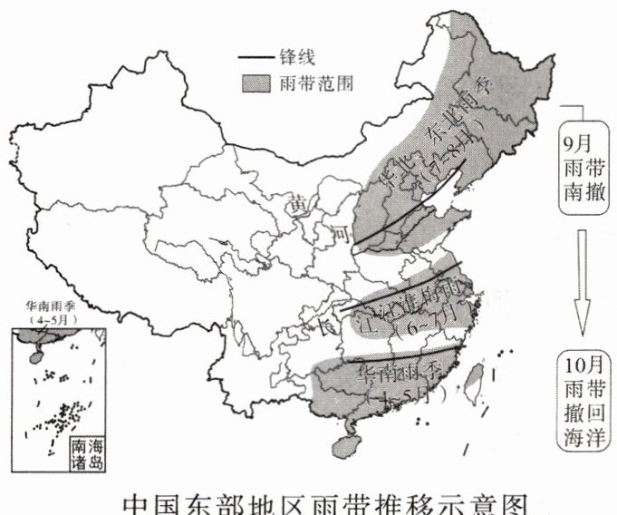 (1)夏季风的强弱、进退直接影响我国东部地区的雨季长短和雨带推移。通常,南方雨季开始