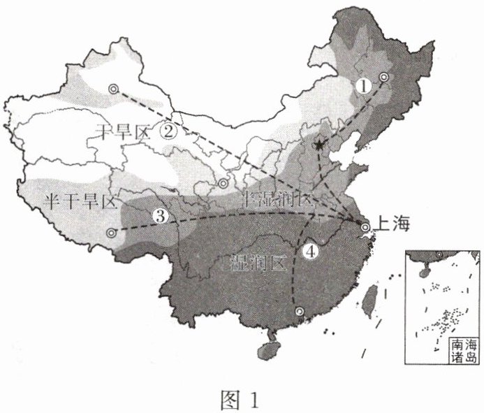 (2)路线______(填序号)途经我国四类干湿地区,这条路线充分体现出我国降水的空间分布规律是______。