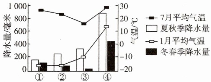 )A. ①——降水总量多,季节变化小