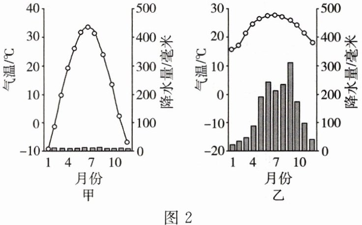 (4)根据甲、乙两地的气温、降水情况,判断其所属气候类型:甲