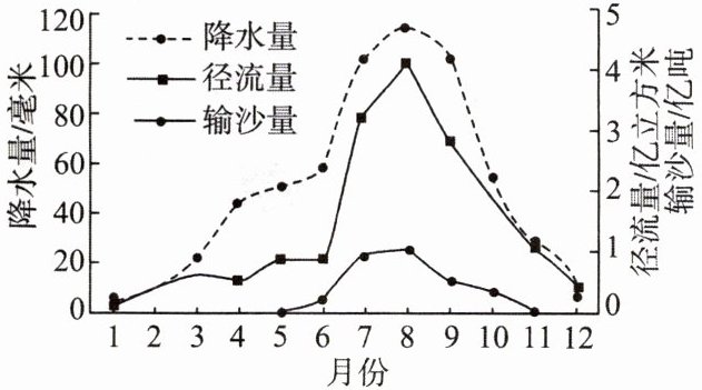 下图为中国某河流中游某水文观测站的多年月平均降水量、径流量、输沙量变化示意图。