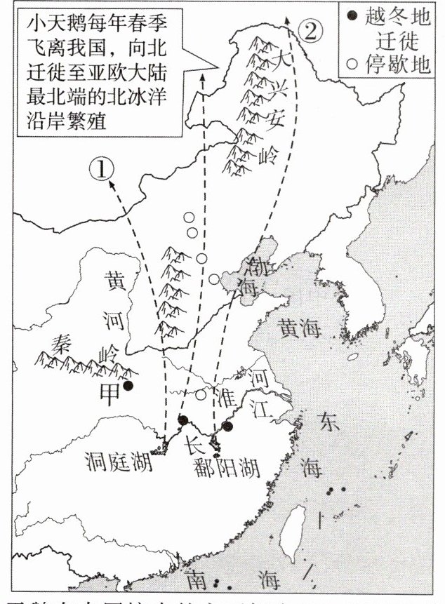 读小天鹅在中国境内的主要栖息地和迁徙路线图,完成 6~7 题。