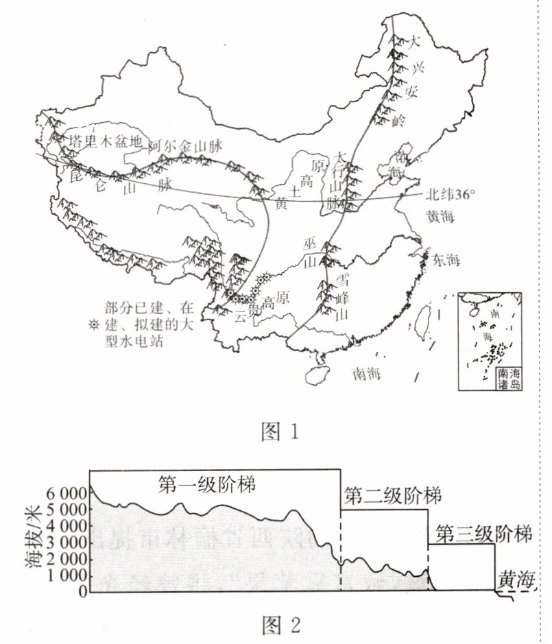 材料三:图 1 为中国地势三级阶梯及部分大型水电站分布示意图,图 2 为中国沿 $ 36^{\circ}N $ 纬线附近地形剖面示意图。