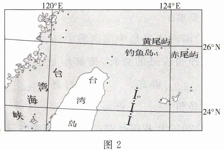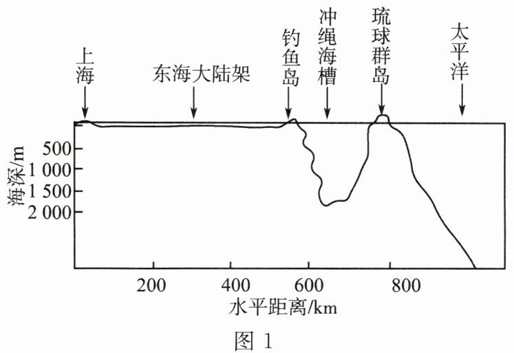 读图 1 钓鱼岛附近海底地形剖面图及图 2 钓鱼岛及其附属岛屿位置示意图,完成下列题目。