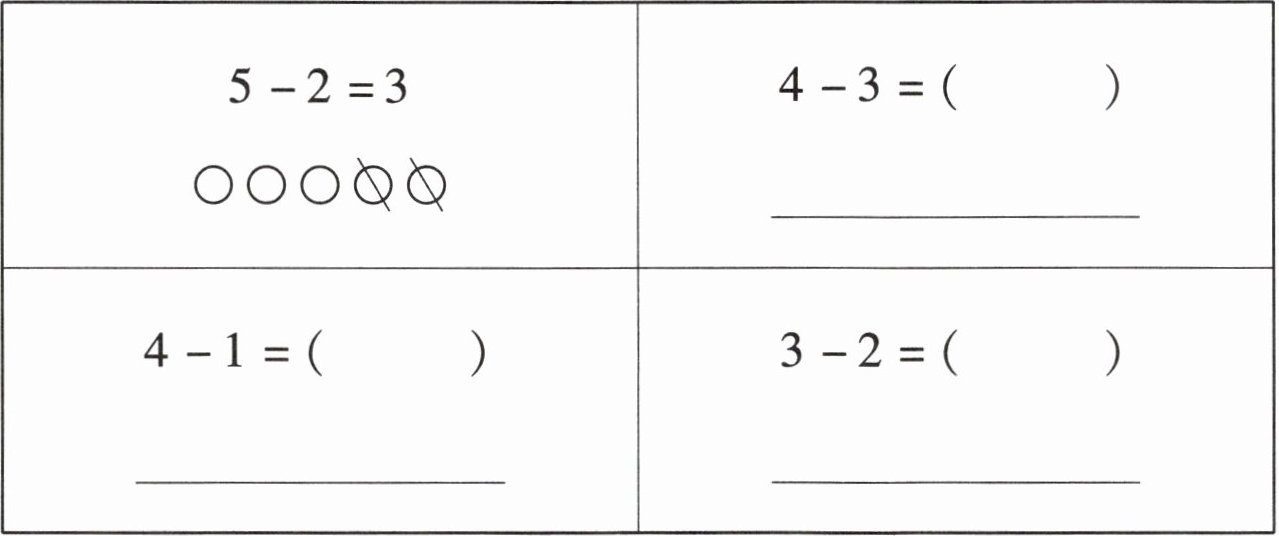 【解析】:通过观察插图,原来有5只小鸡,走了1只小鸡,还剩4只小鸡。用减法计算,5-1=4。
