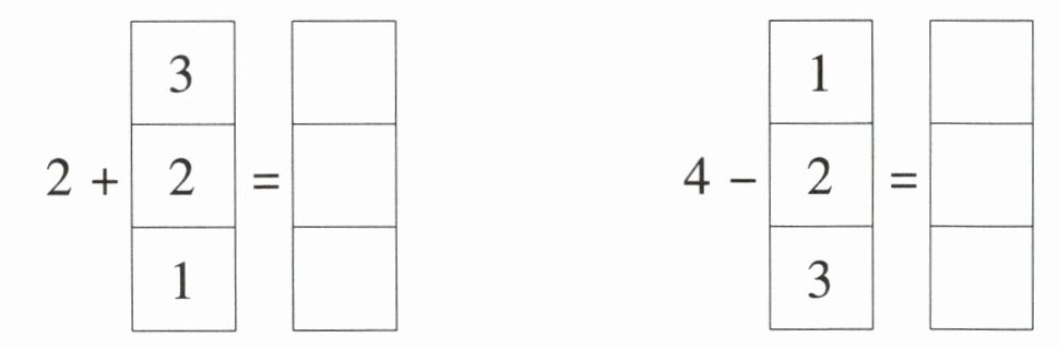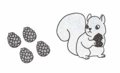 【解析】:1. 图1中笔筒原有4支笔,又放入1支,所以4+1=5,读作:4加1等于5。2. 图2中共有5个松果,松鼠拿走1个,所以5-1=4,读作:5减1等于4。