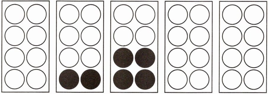从左到右,第三幅图涂 4 个圆,第二幅图涂 2 个圆,其余图不涂(已满足每幅图涂的圆数量依次为 0、2、4、0、2 循环的规律 ,可根据此涂色)。