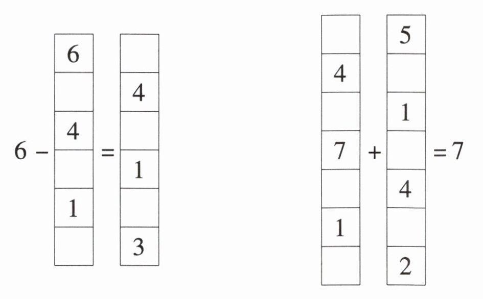 $7 - 4 = 3$,$3 + 2 = 5$,$6 - 5 = 1$,$4 + 2 = 6$,