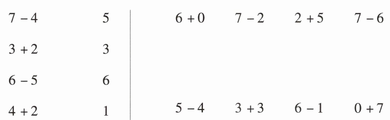 【答案】:$7 - 4$—$3$,$6 + 0$—$6$,$6 - 5$—$1$,$4 + 2$—$6$