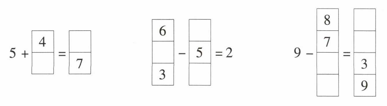 $5 + 4 = $ $4 + 5 = $ $2 + 6 = $ $7 - □ = 1$