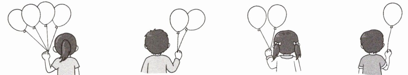 【解析】:观察每个小朋友拿气球的手,以小朋友自身的左右为标准,确定右手拿的气球并涂色。第一个小朋友左手拿4个气球,第二个小朋友右手拿2个气球,第三个小朋友左手拿2个气球,第四个小朋友右手拿1个气球,分别对这些气球涂色。