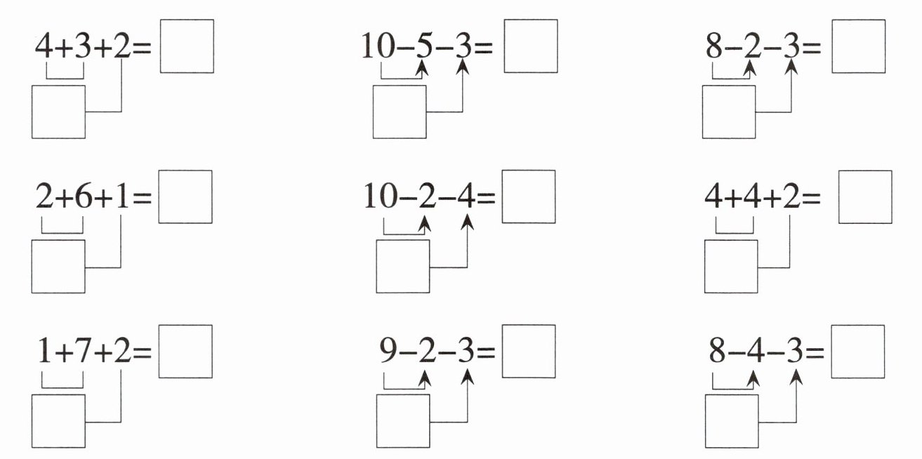 | $1 + 3 + 6 = 10$ | $2 + 5 + 2 = 9$ | $9 - 2 - 3 = 4$ | $8 - 7 - 1 = 0$ |