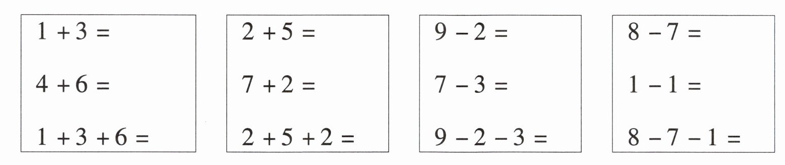 | $4 + 6 = 10$ | $7 + 2 = 9$ | $7 - 3 = 4$ | $1 - 1 = 0$ |
