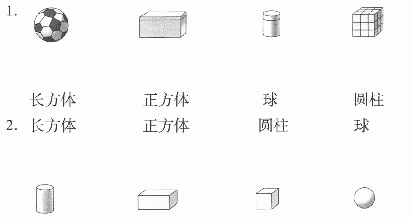 1. 足球连球,第二个图形连长方体,第三个图形连圆柱,第四个图形连正方体;2. 第一个图形连圆柱,第二个图形连长方体,第三个图形连正方体,第四个图形连球。