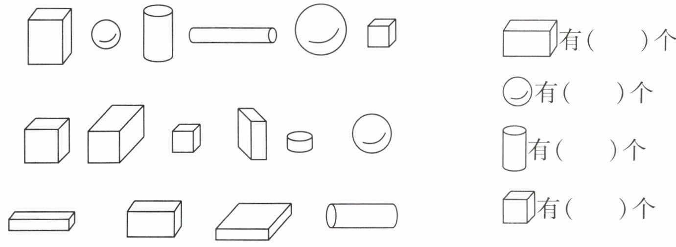 2. 长方体涂一种颜色,有5个;球涂一种颜色,有3个;圆柱涂一种颜色,有4个;正方体涂一种颜色,有3个。