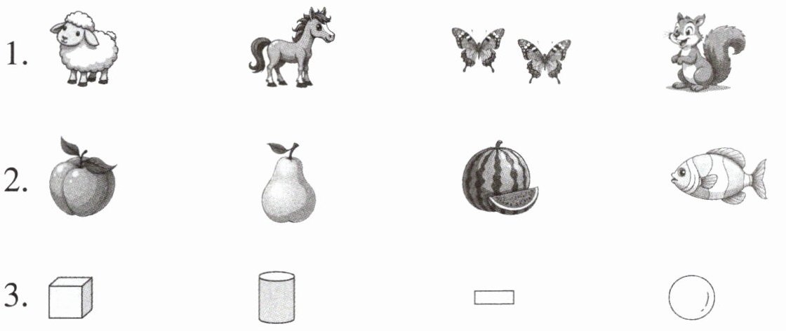 2. 我会分,我会涂,我会填,把同一类的图形分别涂上相同的颜色。