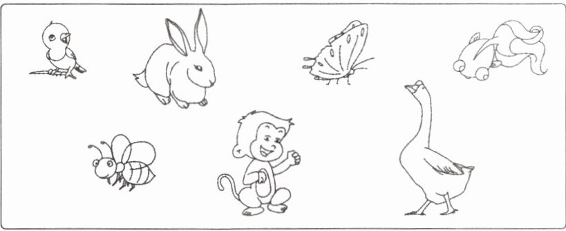 1. 会飞的动物:小鸟、蝴蝶、蜜蜂(涂黄色);会游的动物:鱼、鹅(涂蓝色)。