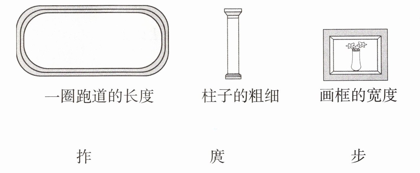一圈跑道的长度-步;柱子的粗细-庹;画框的宽度-拃