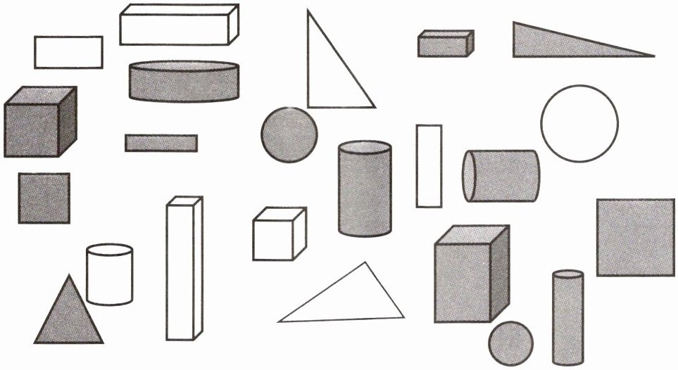| 长方形(含长方形面立体图形的面不算)相关的立体(长方体)及单独长方形(这里把长方体按有长方形面算入广义长方形类相关统计不便,只按平面图形和对应立体分开常见统计方式,这里按平面图形和立体图形分) 平面长方形(单独平面长方形)和长方体算一类(按立体和平面分不太准确,本题更合理按平面和立体分),平面长方形(单独)和长方体共 7 个;圆柱、圆、三角形(平面)、正方体、球(这里无球,忽略)等算一类不太合理,重新按平面图形和立体图形分: