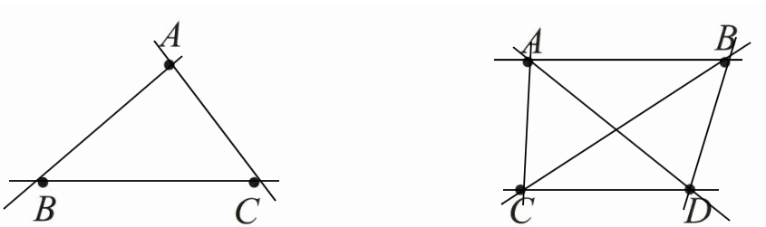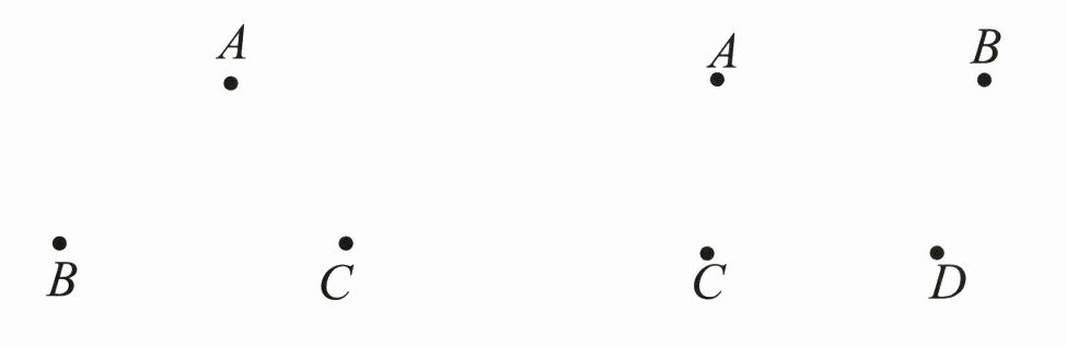 2. 如图,不在同一直线上的A、B、C三个点,经过其中的两个点画直线,最多可以画多少条?如果再增加一个D点,最多可以画多少条?(先画一画,再回答。)(8分)