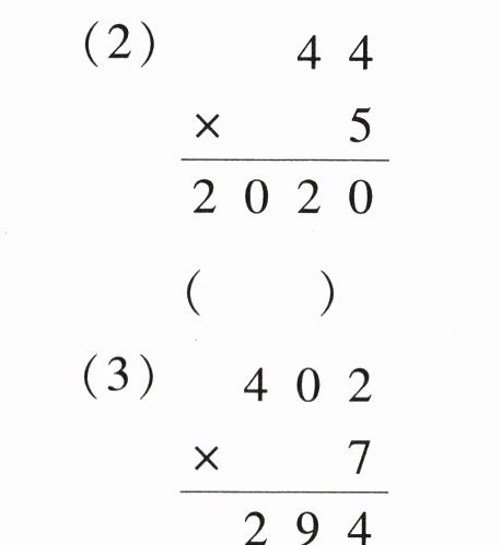 (1) ×,改正:50+50×7=50+350=400;(2) ×,改正:$\begin{array}{r}44\\×5\\\hline220\end{array}$;(3) ×,改正:$\begin{array}{r}402\\×7\\\hline2814\end{array}$