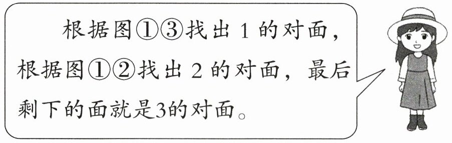 根据图①③找出 1 的对面,根据图①②找出 2 的对面,最后剩下的面就是 3 的对面。