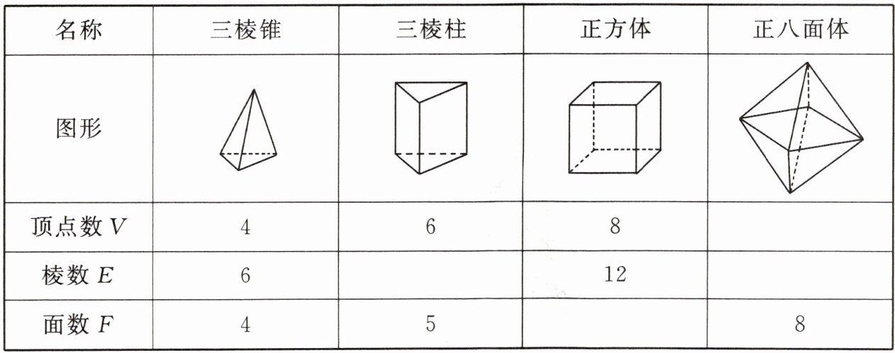 (2) 分析表中的数据,你能发现 $V$,$E$,$F$ 之间有什么关系吗?请写出三者之间的关系式:
